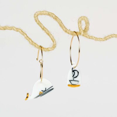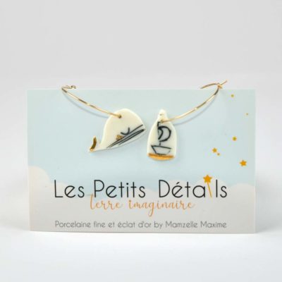 Forme en porcelaine découpée et façonnée patiemment à la main, cuite plusieurs fois à haute température avant d’être fixée sur une monture en gold filled (laiton plaqué or, plus durable qu’un plaquage or classique) qui vous évitera tout risque d’allergie.