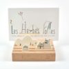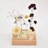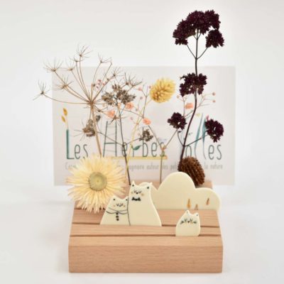 A l’arrière-plan, des trous de différents diamètres accueillent les végétaux récoltés par vos soins lors de vos balades nature et mis en scène afin de personnaliser la décoration.