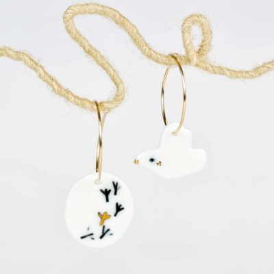 Forme en porcelaine découpée et façonnée patiemment à la main, cuite plusieurs fois à haute température avant d’être fixée sur une monture en gold filled (laiton plaqué or, plus durable qu’un plaquage or classique) qui vous évitera tout risque d’allergie.