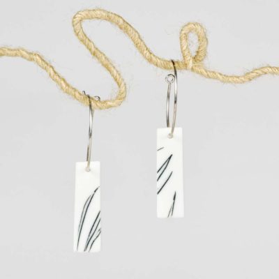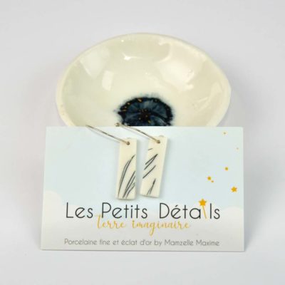 Forme en porcelaine découpée et façonnée patiemment à la main, cuite plusieurs fois à haute température avant d’être fixée sur une monture en argent 925, qui vous évitera tout risque d’allergie.