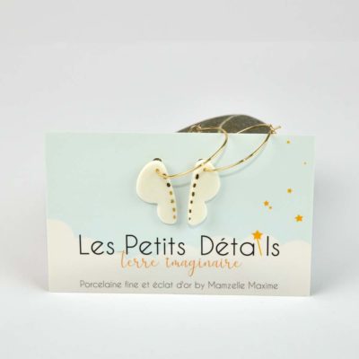 Forme en porcelaine découpée et façonnée patiemment à la main, cuite plusieurs fois à haute température avant d’être fixée sur une monture en gold filled (laiton plaqué or, plus durable qu’un plaquage or classique) qui vous évitera tout risque d’allergie.