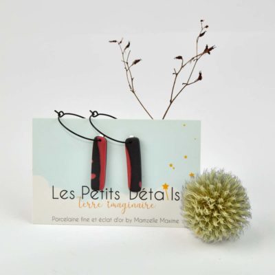 Forme en porcelaine découpée et façonnée patiemment à la main, cuite plusieurs fois à haute température avant d’être fixée sur une monture en laiton teinté noir – anallergique qui vous évitera tout risque d’allergie.