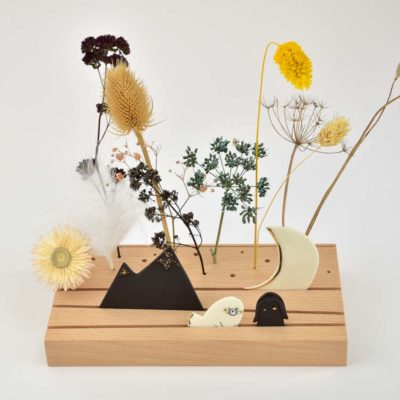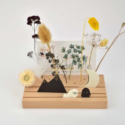 A l’arrière-plan, des trous de différents diamètres accueillent les végétaux récoltés par vos soins lors de vos balades nature et mis en scène afin de personnaliser la déco.